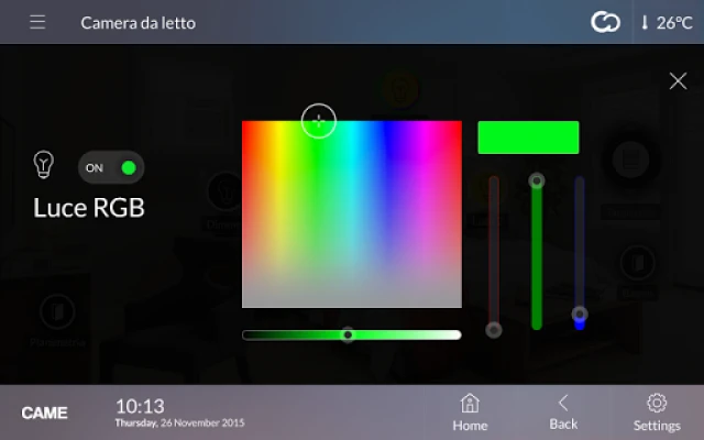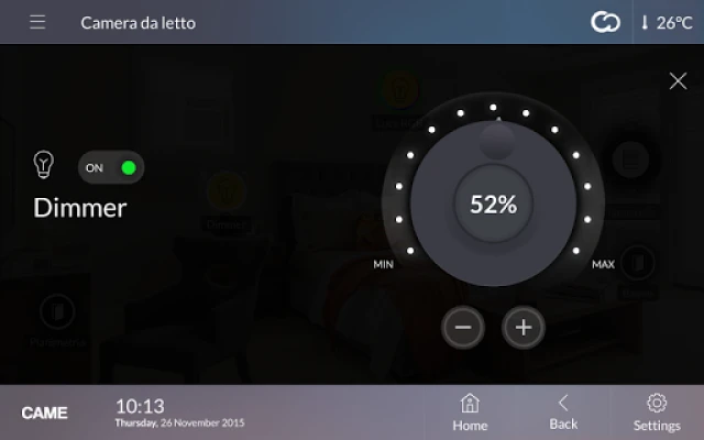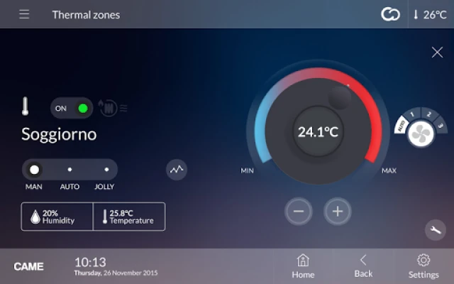 Domotic 3.0 lets you manage all the functions of the Came home automation system via a simple, intuitive graphical interface. You browse simple functions or graphic-map menus. These recreate images of the various rooms around your home. All of the functions featured in the system, like operator management, thermostat control, lighting control, shutter or awning opening and closing, burglar alarm control and scenario management, are readily available to users via the portable device on which Domotic 3.0 is installed.