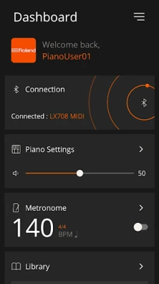 • An internet connection is required to use the features of Roland Piano App, including recording, Library access, and addition preset functionality. Any communication expenses (packet communication fees, etc.) incurred while using this application will be charged to customers.