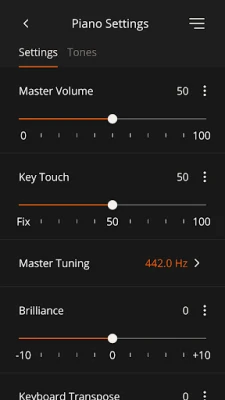 • Control piano functions such as transpose, split, key touch, ambience, and more